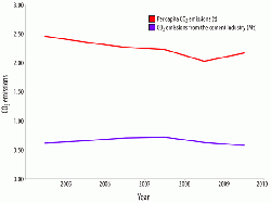 Given that the worldwide cement industry contributes approximately 5% of global CO2 emissions, it is an important sector to target for CO2 emissions reductions strategies. Figure 8 shows that CO2 emissions produced during the manufacture of cement in Austria rose from 0.62Mt in 2005 to a peak of 0.72Mt in 2008 and dropped to 0.58Mt by 2010. In contrast, per capita CO2 emissions in Austria fell from 2.46t in 2005 to 2.03t in 2009, before rising again in 2010 to 2.17t. It remains to be seen whether Austria's per capita CO2 emissions will continue to rise, or whether 2010 was merely a blip, although given the extensive CO2 emissions reductions strategies in place in the region, the latter seems more likely.