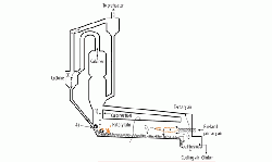 The raw materials are wet and form a slurry that is introduced into the dryer crusher where it is dried and ground. The dry raw materials are then carried upwards to the top cyclone by a gas stream. The gases in the preheater tower are bypassed from the second cyclone to the dryer crusher before going to the top cyclone, which works as gas/dust separator. The hot air from the clinker cooler goes to the calciner and the rotary kiln gases are mixed with the calciner outlet gases.